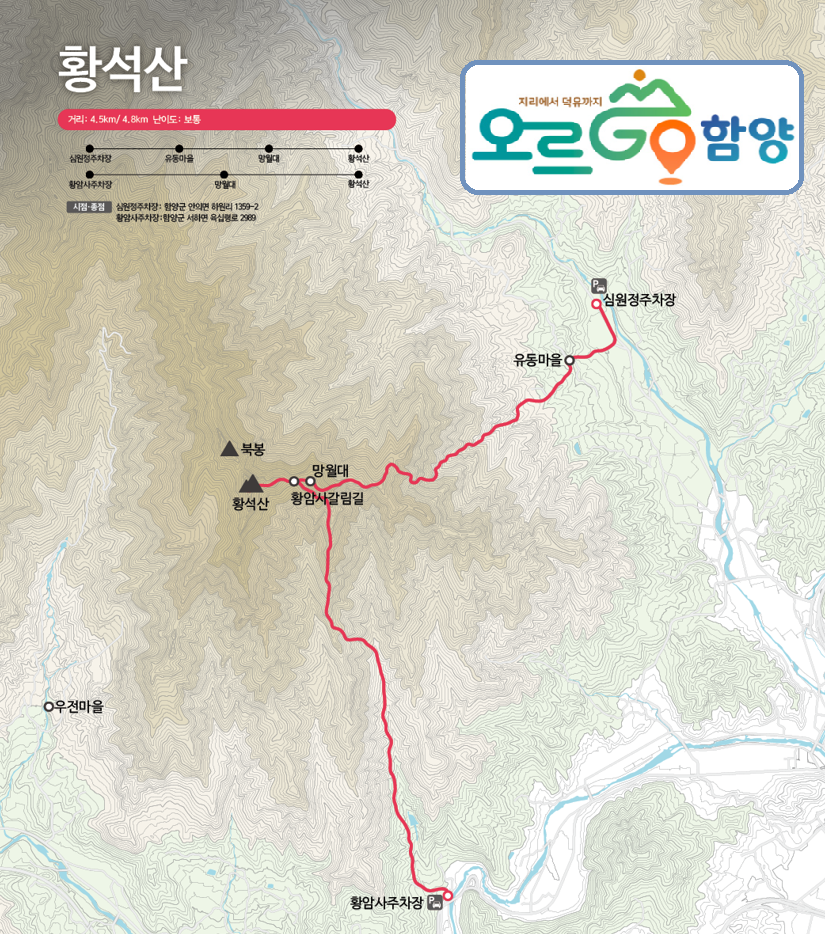 A.코스(황석산 인증) : 유동마을회관-연촌마을-삼거리-망월대-황석산성표지판-황석산정상(인증)-거북바위-장자벌갈림길(장자벌입구 방향 진행)-청량사-0.6km-일주문주차장(약 9.6km/5시간30분)