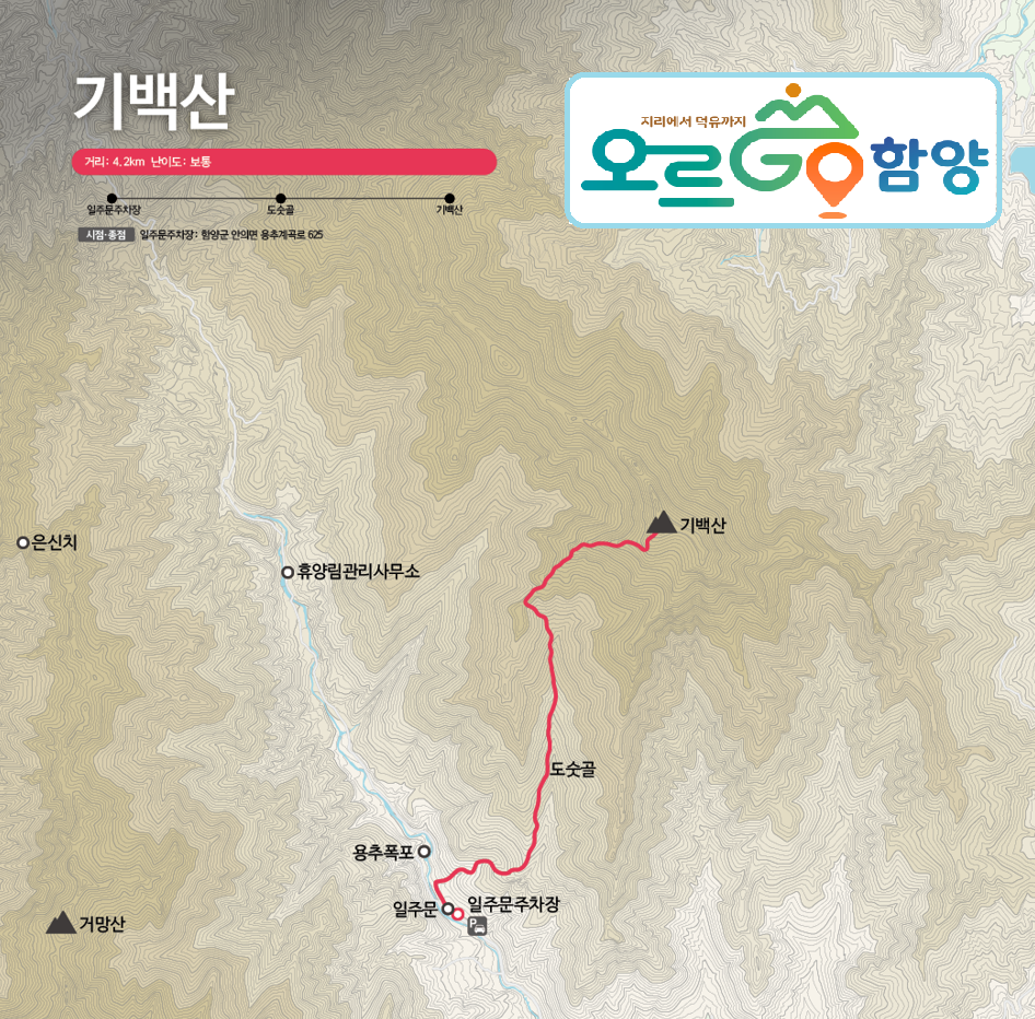 C.코스(기백산 인증) : 일주문주차장-도숫골-기백산 정상(인증)-책바위-시흥골갈림길-시흥폭포-사평마을-용추사-용추폭포-일주문주차장(약 11.2km/5시간30분)