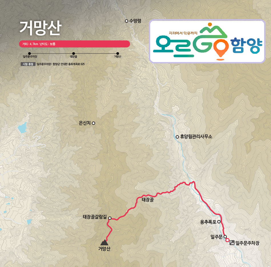 B.코스(황석산+거망산 인증) : 유동마을회관-연촌마을-망월대-황석산성 표지판-황석산정상(인증)-거북바위-장자벌갈림길-거망산(인증)-용추폭포-일주문주차장(약 14km/6시간30분)
