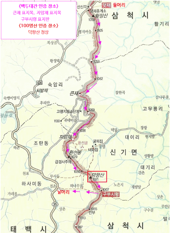 ★ 출발지점 : 강원도 삼척시 하장면 번천리 산 57-6 댓재 ▶댓재-황장산-큰재(인증)-자암재(인증)-환선봉-덕항산(100명산 인증)-구부시령(인증)-(접속)-외나무골교(14.9km/6시간)
